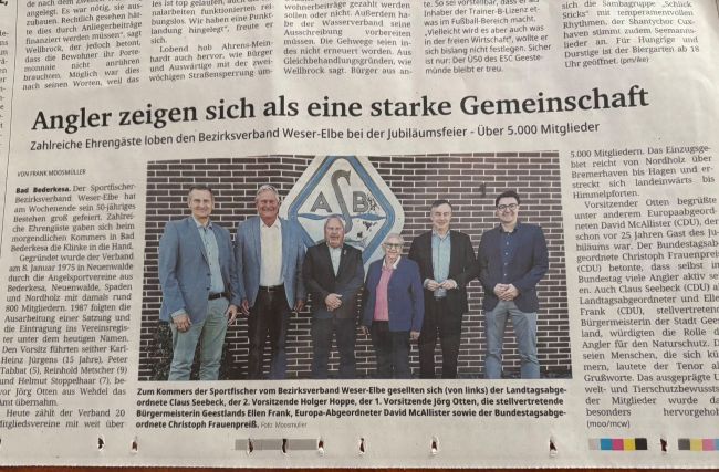 Der Sportfischer-Bezirksverband Weser-Elbe feierte Anfang September sein 50-jähriges Bestehen. Die Mitgliederzahl ist mit der Zeit auf über 5000 gestiegen. Seit 11 Jahren ist unser Vorstandsmitglied, Jörg Otten, 1. Vorsitzender des Bezirksverbandes.
