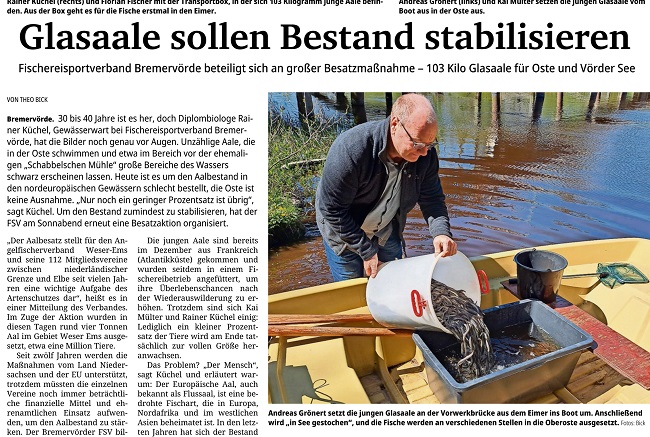 Erfreulich ist, dass immer wieder auch die regionale Presse über diesen Einsatz der für den Aal berichtet. So zum Beispiel die Bremervörder Zeitung über den Besatz durch den Fischereisportverein Bremervörde. Damit wird hoffentlich einer breiteren Öffentlichkeit deutlich, wie sehr sich die Angler für den Bestand der bedrohten Art engagieren.