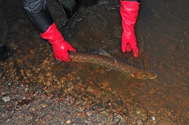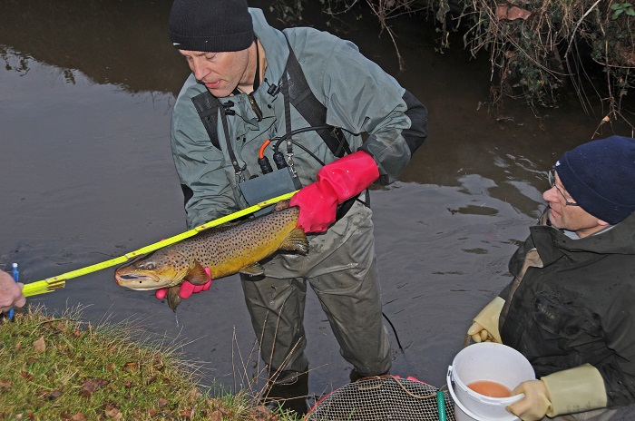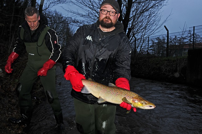 Die Fänge beim E-Fischen waren sogar so gut, dass man von einem Rekordjahr sprechen kann. Beim Monitoring in den November- und Dezemberwochen konnten über 100 Meerforellen und 19 Lachse registriert werden. Das Abstreifen der Fische gelang in einem solchen Umfang, dass die Kapazität der Brutanlage in Oldenburg mit einer Belegung von rund 250 000 Eiern ausgelastet war. Es mussten teilweise sogar Eier in eine andere Brutanlage verfrachtet werden.
