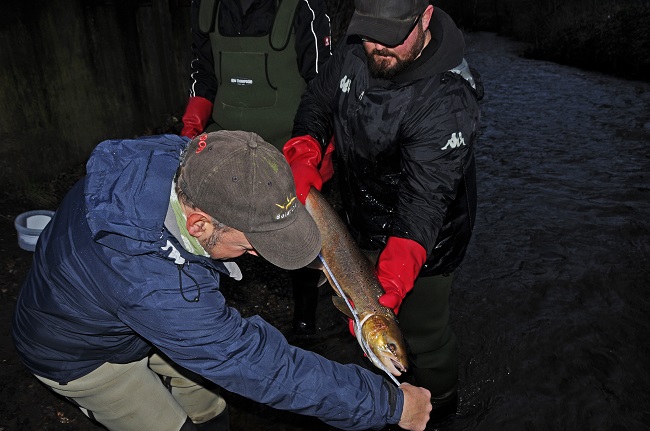 Überwiegend handelt es sich erwartungsgemäß um Meerforelleneier, aber auch die Zahl der befruchteten Lachseier erreichte in diesem Jahr mit etwa 60 000 einen neuen Rekordstand. Gerade in den letzten Tagen vor Weihnachten, als die Laichzeit der Meerforellen bereits weitgehend vorüber war, die der Lachse des Skjernstammes aber erst in der Hochzeit war, konnten noch einige große Lachrogner und -milchner gefangen werden. Damit wurden gute Voraussetzungen geschaffen, um in den Verbandsgewässern im Frühjahr 2018 zahlreiche Brutfische zu besetzen, die als Nachkommen von eigenen Rückkehrern wieder in die Gewässer gelangen.