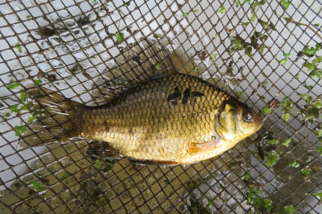 Am 07.10.2025 haben die Mitarbeiter der Fischereibiologischen Station Ems-Hase einen breiten Graben in der Nähe von Haren befischt. Dabei erwartete sie erneut eine Überraschung, dieses Mal eine extrem seltene Fischart: die Karausche (Carassius carassius).