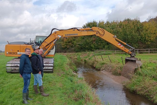 In der Lethe wurde am 22. Oktober mit rund 100 Tonnen Kies eine Reihe weiterer Kiesbetten angelegt. Dieser Kieseintrag bildet die Fortsetzung einer Maßnahme aus dem Jahr 2023 an einem Flussabschnitt unterhalb des Forellenhofes Wulfers im Bereich Mühlenweg, Beverbruch.