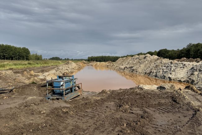 Am 4. September begannen die Bauarbeiten für das unregelmäßig geformte Gewässer auf einer Fläche von etwa 140 x 75 Metern. Die Verbindung der Auenbereiche zum „Fischteichableiter“ bekommt eine Breite von ca. 5 Metern. Die Sohle der Anbindung wird nicht tiefer als die Sohle des „Fischteichableiters“.