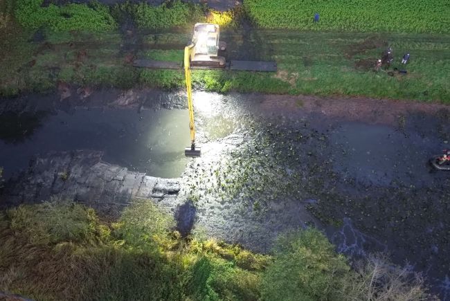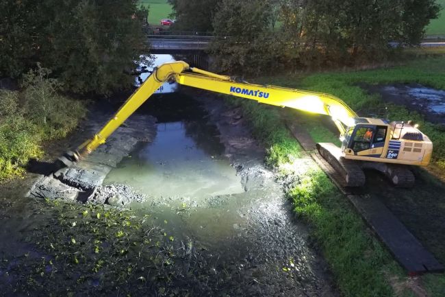 Entschlammung des Gewässers am Abend mit Beleuchtung.